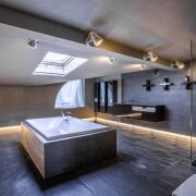 3-ий уровень – приватный. Здесь находится хозяйская спальня, к ней прилегает гардеробная. И размещен хозяйский санузел, в котором установлена душевая кабина. И есть возможность принимать ванну, любуясь звездами из мансардного окна, которое расположено прямо над ванной)