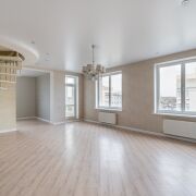 Грамотно продуманная планировка представлена тремя жилыми комнатами (37,4 кв.м, 27,6 кв.м и 19,9 кв.м), кухней (25,4 кв.м), тремя санузлами и просторной гардеробной (9,1 кв.м).