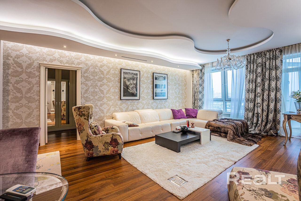 3-х комнатная квартира на ул. Сторожовская, 6. Дом расположен в центре Минска, на берегу реки Свислочи, рядом станция метро Немига, Оперный театр, парк Янки Купалы, супермаркет Корона, торговые центы Немига и Галерея. Двор огорожен, во дворе детская площадка, спортивная площадка со специальным покрытием, ведется видеонаблюдение, охрана 24/7. В подъезде консьерж. Квартира расположена на 4 этаже 12 этажного блочного дома. Площадь квартиры 151,5 м кв., жилая 117,9 м.кв.м. Кухня 12,9 м.кв.. высокие потолки 3,03 м. Большая гостиная с видом на реку и лоджией. Две спальни, одна из них с видом на Свислочь, вторая с видом во двор, с большими вместительными встроенными шкафами, 2 ванных комнаты, кухня с импортной бытовой техникой. 2 лоджии застекленных и балкон. Полы: паркетная доска, плитка керамогранит с подогревом, входная дверь металлическая со звукоизоляцией, межкомнатные двери деревянные, окна стеклопакеты ПВХ, сантехника Villeroy&Boch, кондиционеры в каждой комнате, мебель качественная, стильная, брендированная от производителей Hermes, Fendi и др. Квартира продается с мебелью. Есть место подземном паркинге, оно входит в стоимость квартиры.