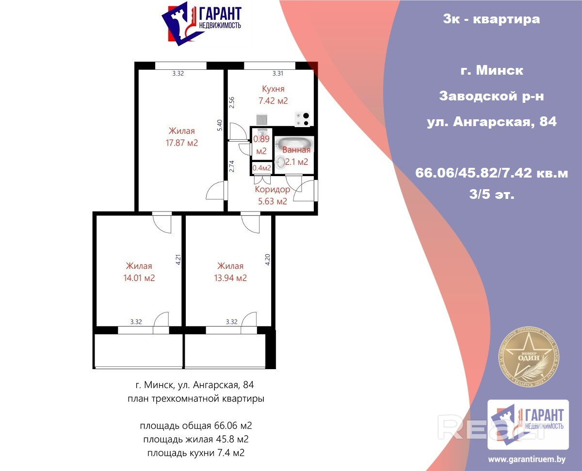 Продается 3х комнатная квартира с раздельными комнатами (17.87, 13.94, 14.01) и двумя балконами. по ул.Ангарская, 84. Расположена на 3этаже пятиэтажного дома. Окна выходят в тихий двор и на сосновую зеленую зону. Санузел раздельный. Рядом с домом хорошо развитая инфраструктура (школы, сады, банки, рынок, магазины). До метро Могилевская 4 остановки. Удобный выезд на МКАД.