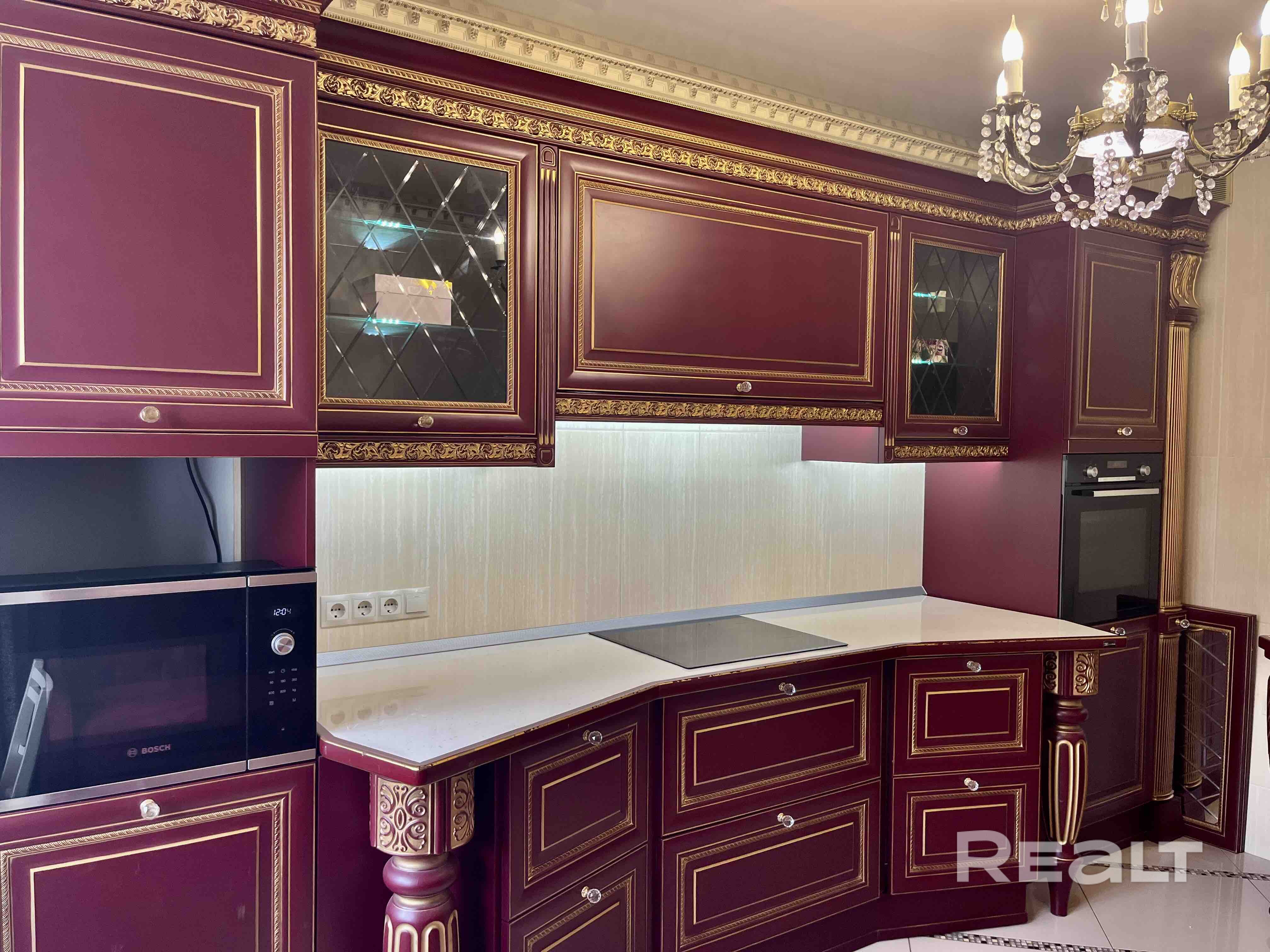 Кухня выполнена из натурального массива , имеет красивый винный цвет, декор в золотом цвете украшает элементы кухни, встроенная бытовая техника в новом состоянии производителя Bosch.