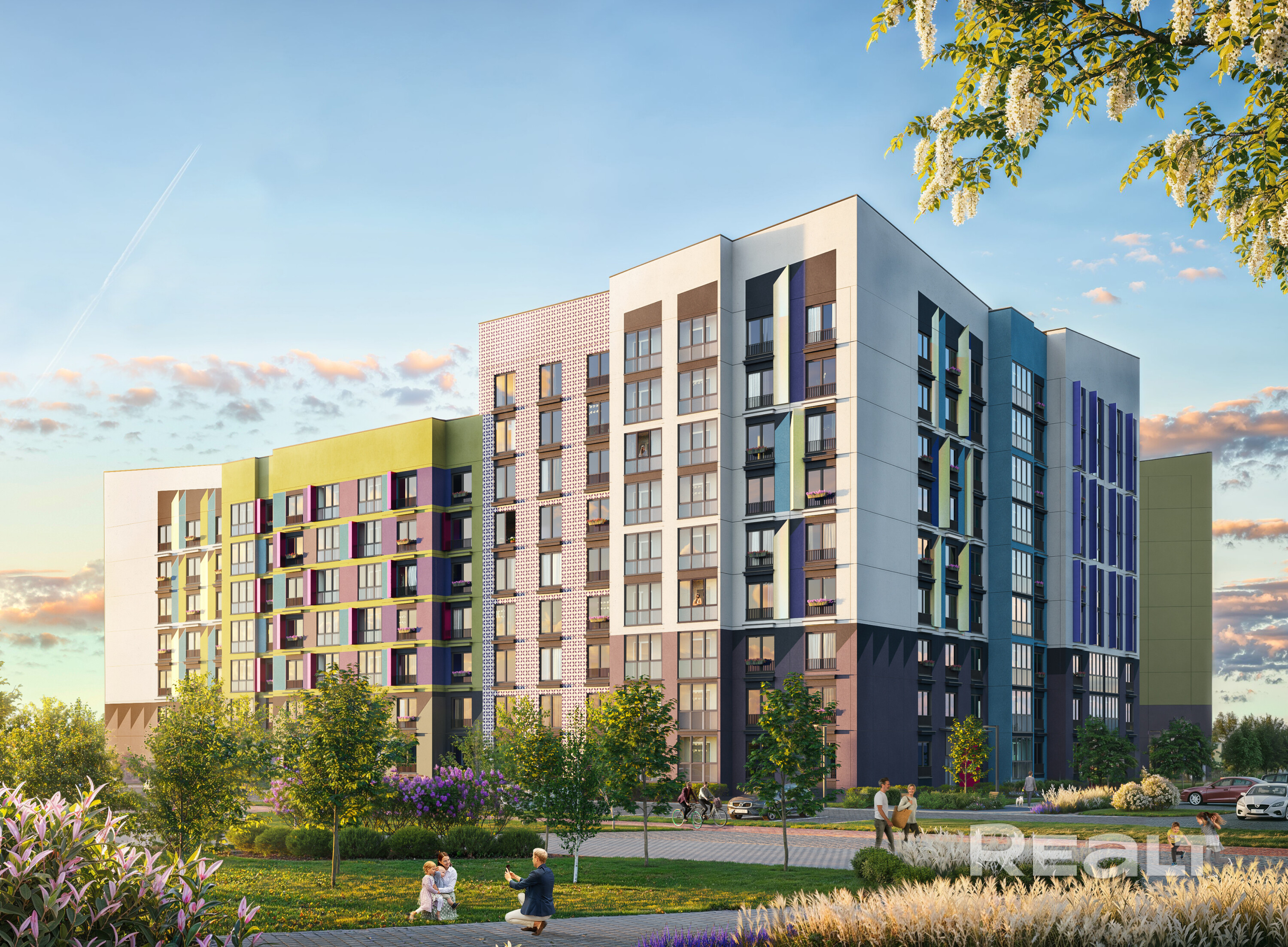 Дом 7.31 выполнен в уникальной палитре сиреневых, зеленых, голубых и бирюзовых оттенков, с декоративными розовыми панелями и паттернами сирени, создающими гармоничную композицию застройки парка.