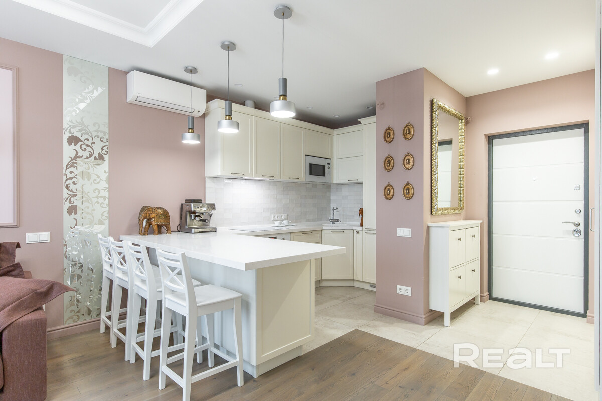 Ремонт в квартире выполнен по авторскому дизайнерскому проекту. Квартира укомплектована качественной, функциональной и современной бытовой техникой и мебелью, а при отделке использованы исключительно строительные материалы премиум класса. Встроенная кухня с бытовой техникой (варочная панель, духовой шкаф, встроенный холодильник). Кондиционер, теплые полы.