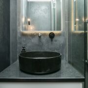 Дизайнерские предметы интерьера в основном от скандинавских производителей, но есть некоторые вещи сделаны и белорусскими мастерами. Переход от темно-синего к серому символизирует глубины космоса, а круги светильника — планеты. Освещение и цветовая гамма вместе образовали таинственную, космическую атмосферу.