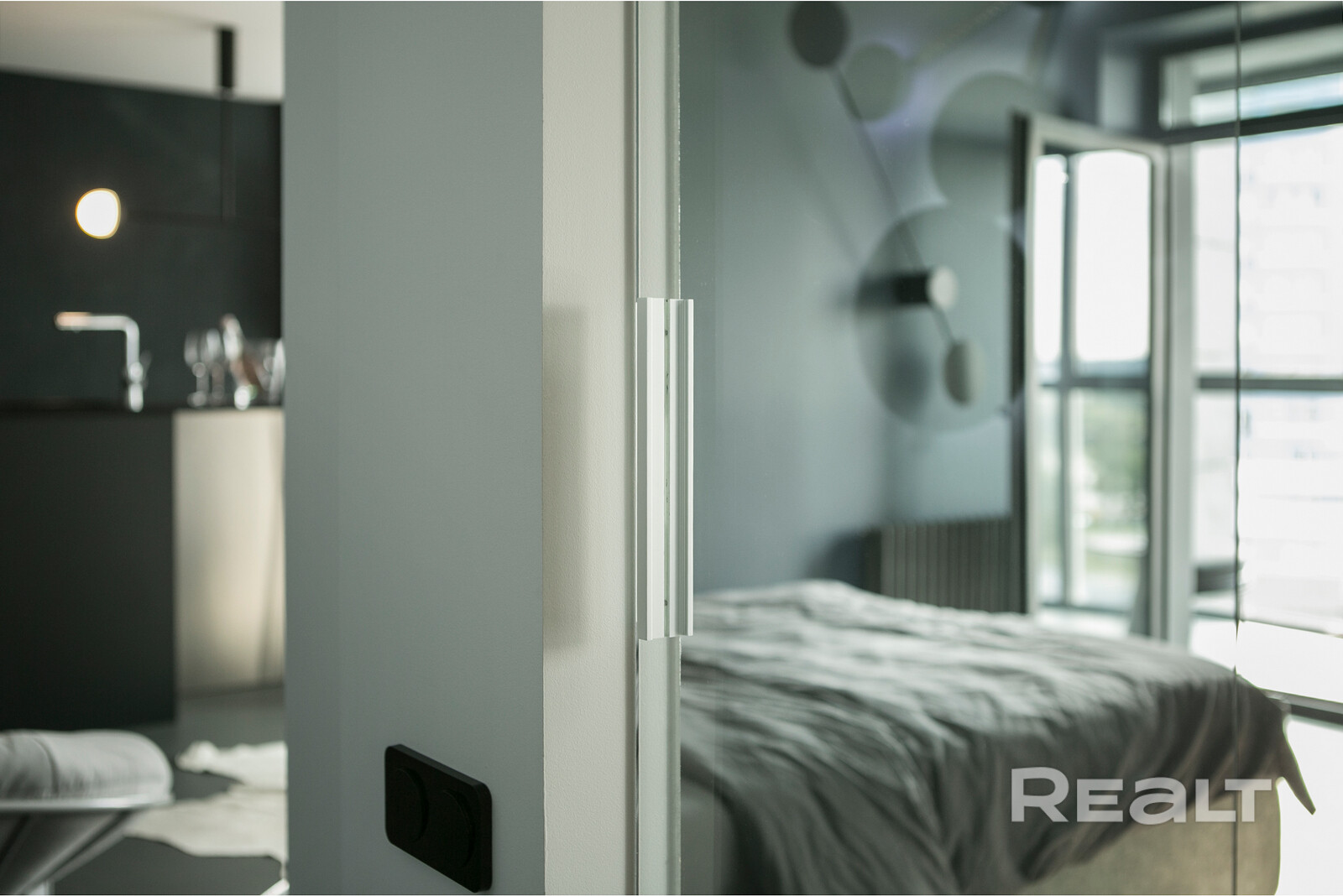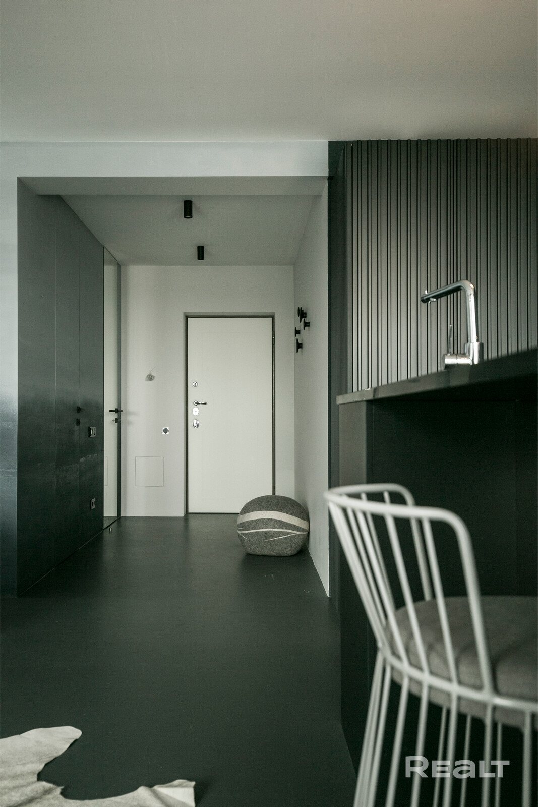 Квартира светлая благодаря окнам в пол и минимуму перегородок: прихожая плавно перетекает в гостиную и коридор. Таким образом создается впечатление большой квартиры, тогда как общая площадь достаточно скромная. Справа от входа — зеркальная дверь, за которой находится кладовая комната, где можно организовать хранение вещей. Далее идет санузел, выдержанный, как и вся квартира, в монохромных тонах.