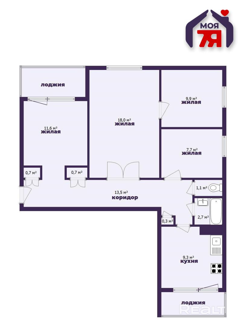 - 4 изолированные комнаты позволяют каждому члену семьи иметь своё личное пространство, а большая кухня, площадью 9,3 кв.м. позволит свободно разместить всю мебель и бытовую технику.