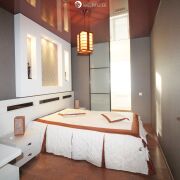 Сочетание светлого и темного в спальной комнате создает необычный контраст, что придает интимности и, что может показаться неожиданным, спокойствия. Белый же цвет ассоциируется с легкостью и свободой. Темный потолок и легкий свет создают ощущение высоты, полета и космоса. В спальной комнате выделено гардеробное помещение – мечта всех проживающих в квартирах и гарантия порядка в квартире.