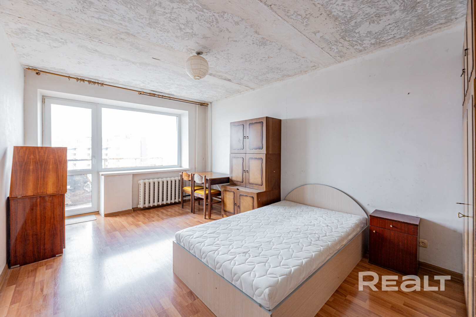 - Комната площадью 16.93 м2 с новым балконным блоком и выходом на длинный открытый балкон. На полу ламинированное покрытие, обои сняты.