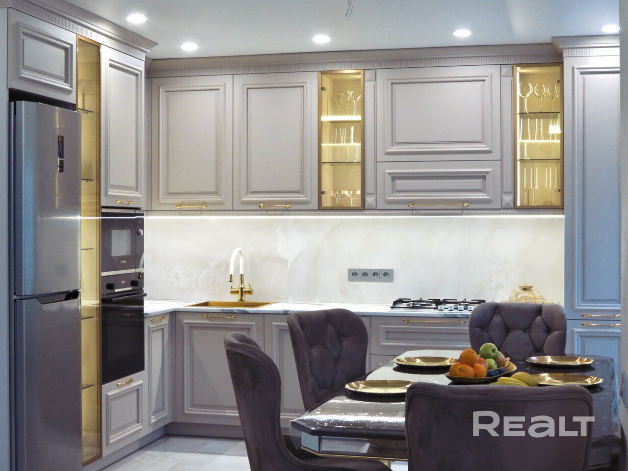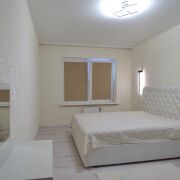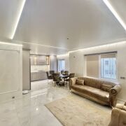 Эта квартира - история про то место, где, убежав от современного ритма жизни, вы сможете укутаться в домашнюю теплоту гостиной с роскошной мягкой мебелью и домашним кинотеатром, про шикарную современную кухню, на которой невозможно готовить без удовольствия, и про те традиции, которые вы в ней создадите! Тут вас ждет комфортная изолированная спальня с гардеробной в виде вместительного углового шкафа - место для отдыха и уединения, которая позволит оставить за пределами дома ежедневную рутину и заботы. Так же эта изолированная комната может выполнять функции детской или гостевой комнаты, рабочего кабинета. Стены в гостиной, коридоре и откосы на окнах выровнены под покраску и отделаны венецианской штукатуркой «Карта мира», натяжные-парящие потолки имеют контурную подсветку по периметру, с 3-Д островом. Мебель – крашеный МДФ с доводчиками и петлями фирмы Blum.
