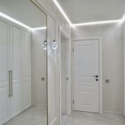 в коридоре находится вместительный гардеробный шкаф, где организована зона для хранения чемоданов и домашней бытовой техники;