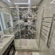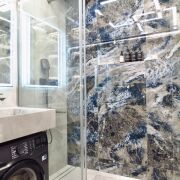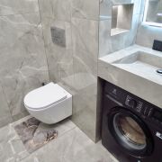 В ванной: встроенный смеситель Paulmark salix Sa213419-Gw, тропический душ скрытого монтажа; стиральная машина Electrolux sensicare 600 EW65N406BXI); умывальник выполнен из керамогранита, большое зеркало и полочки имеют подсветку и отдельные выключатели; принудительная вентиляция; совмещенный санузел; установлена инсталяция Berger ;