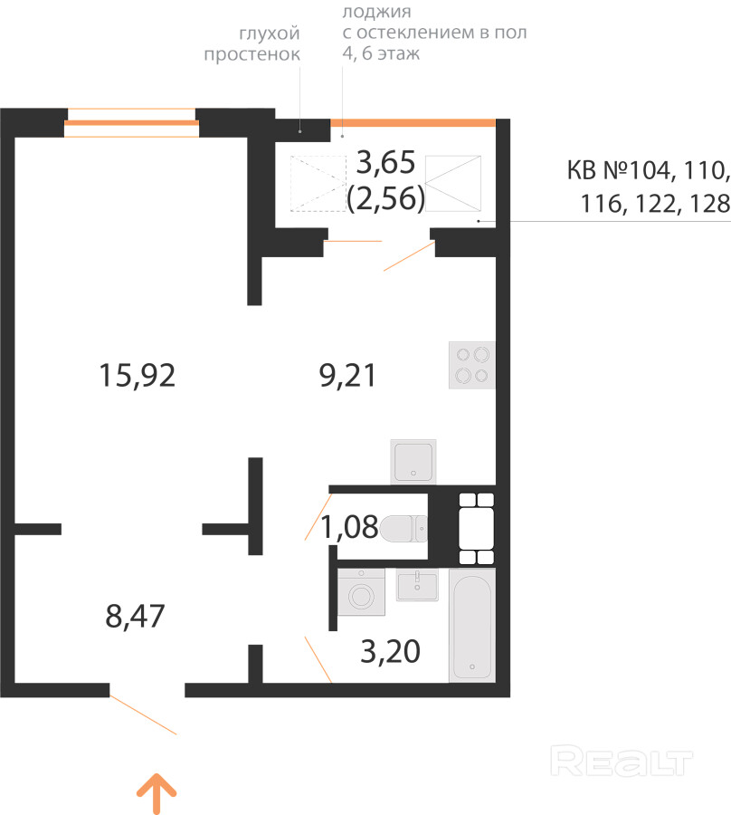 Планировка квартиры одна из самых популярных в комплексе. У Вас в квартире будет просторная комната 15,92 м2, кухня 9,21 м2, лоджия, раздельный санузел и функциональная прихожая, где можно будет обустроить гардеробную.
