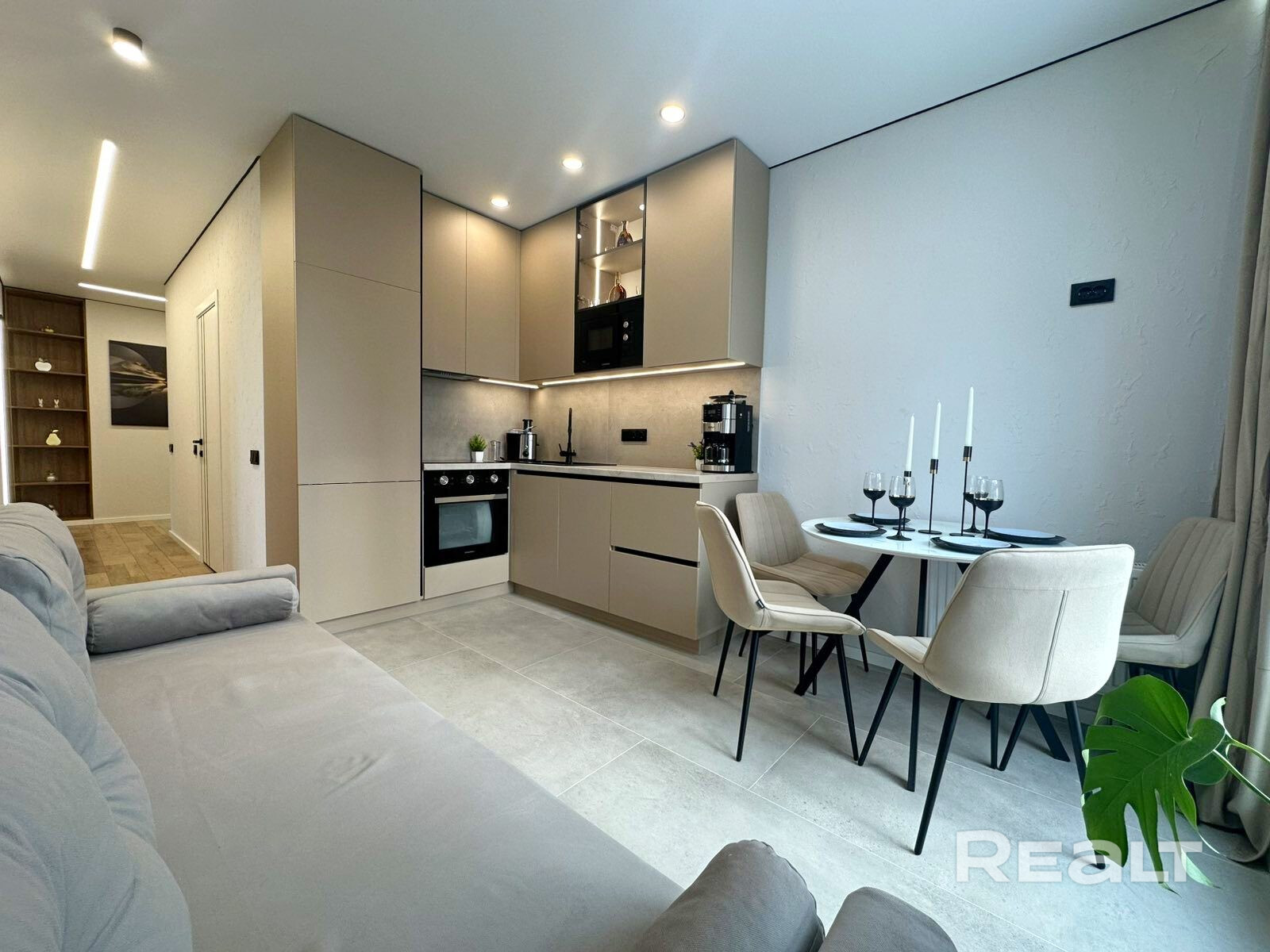 -Установлен дизайнерский кухонный гарнитур из МДФ AGT с механизмами GTV и BLUM со встроенной техникой Maunfeld: духовой шкаф, индукционная варочная панель, вытяжка, микроволновая печь, посудомоечная машина, холодильник, кофе машина и соковыжималка (вся техника новая на гарантии).