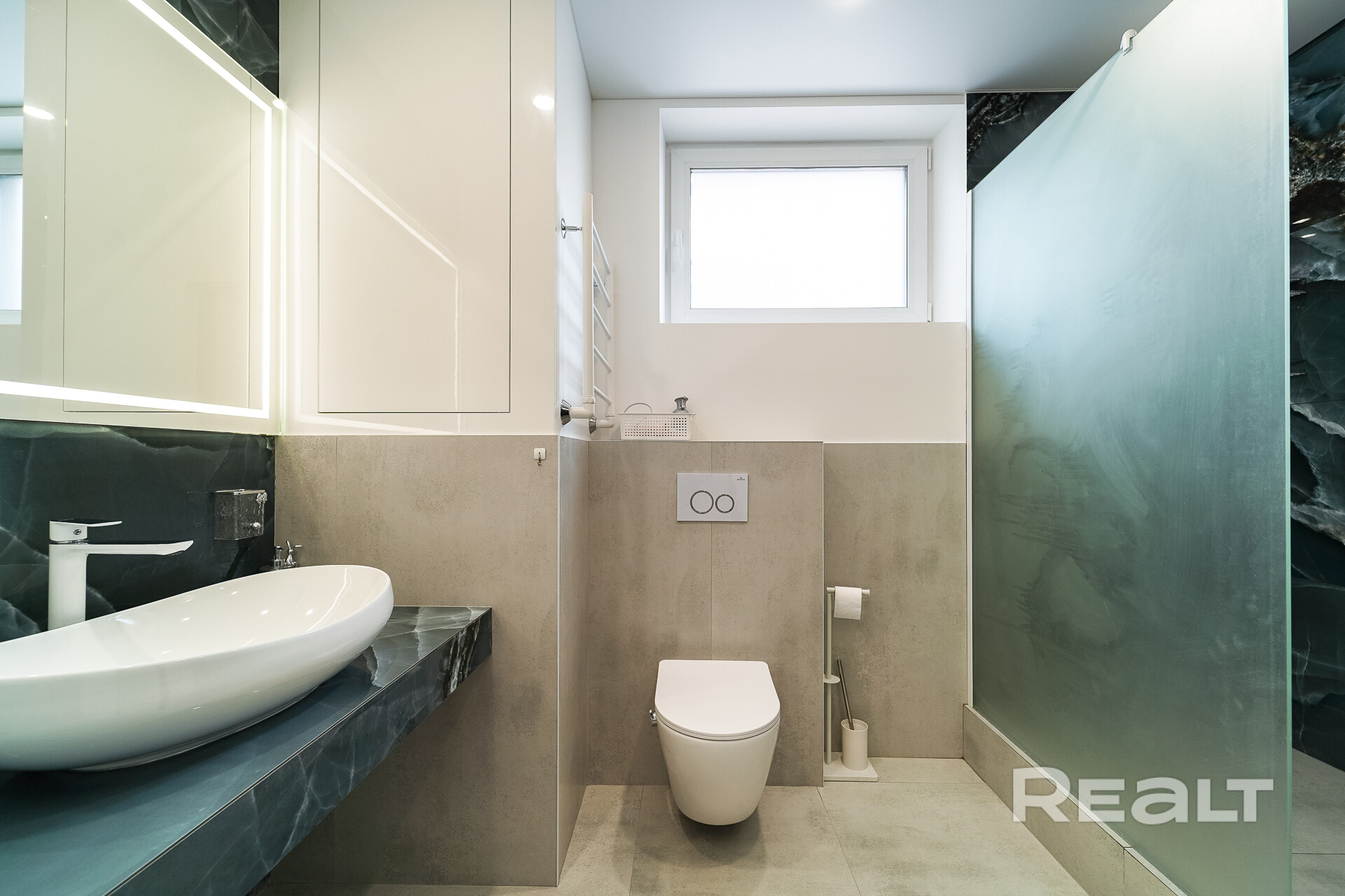 В квартире 2 санузла: оборудованы стиральной машиной, встроенными инсталляциями и облицованы испанской плиткой с глубоким каменным рисунком. В основной ванне установлен тропический душ, со встроеным трапом и перегородкой из закалённого матового стекла. В зеркалах, над накладным умывальником, установлена встроенная подсветка.
