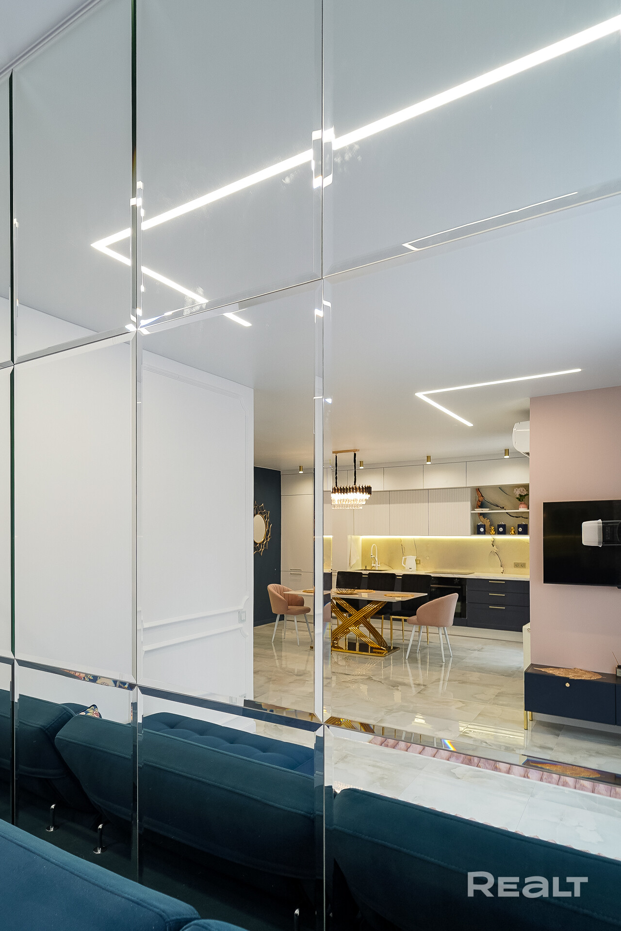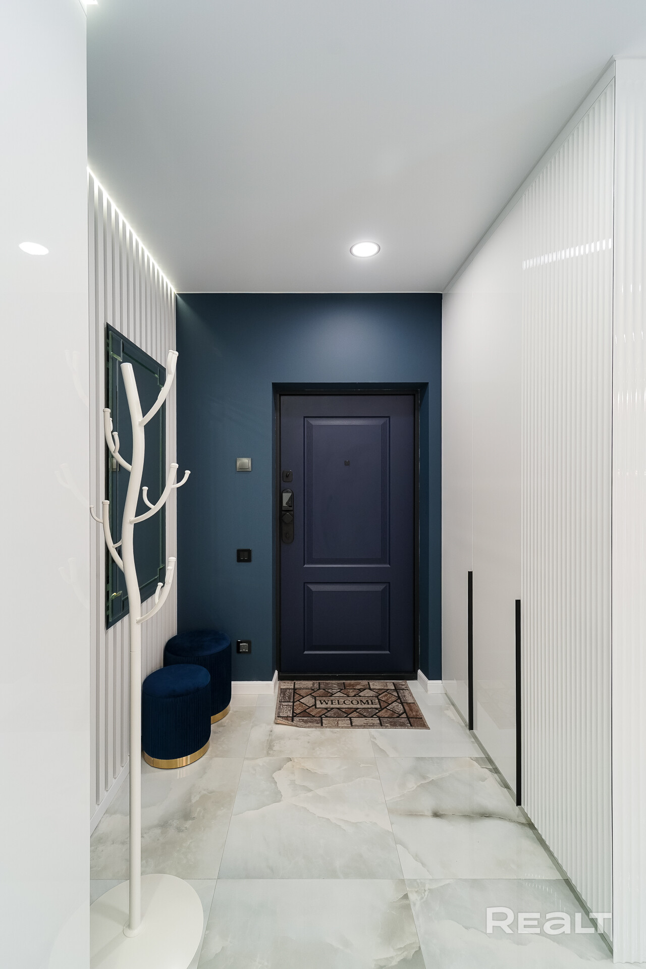 В коридоре установлены распашные шкафы с вертикально-глянцевыми фасадами, напротив стильное зеркало с фацетами и подсветками от теневого натяжного потолка.