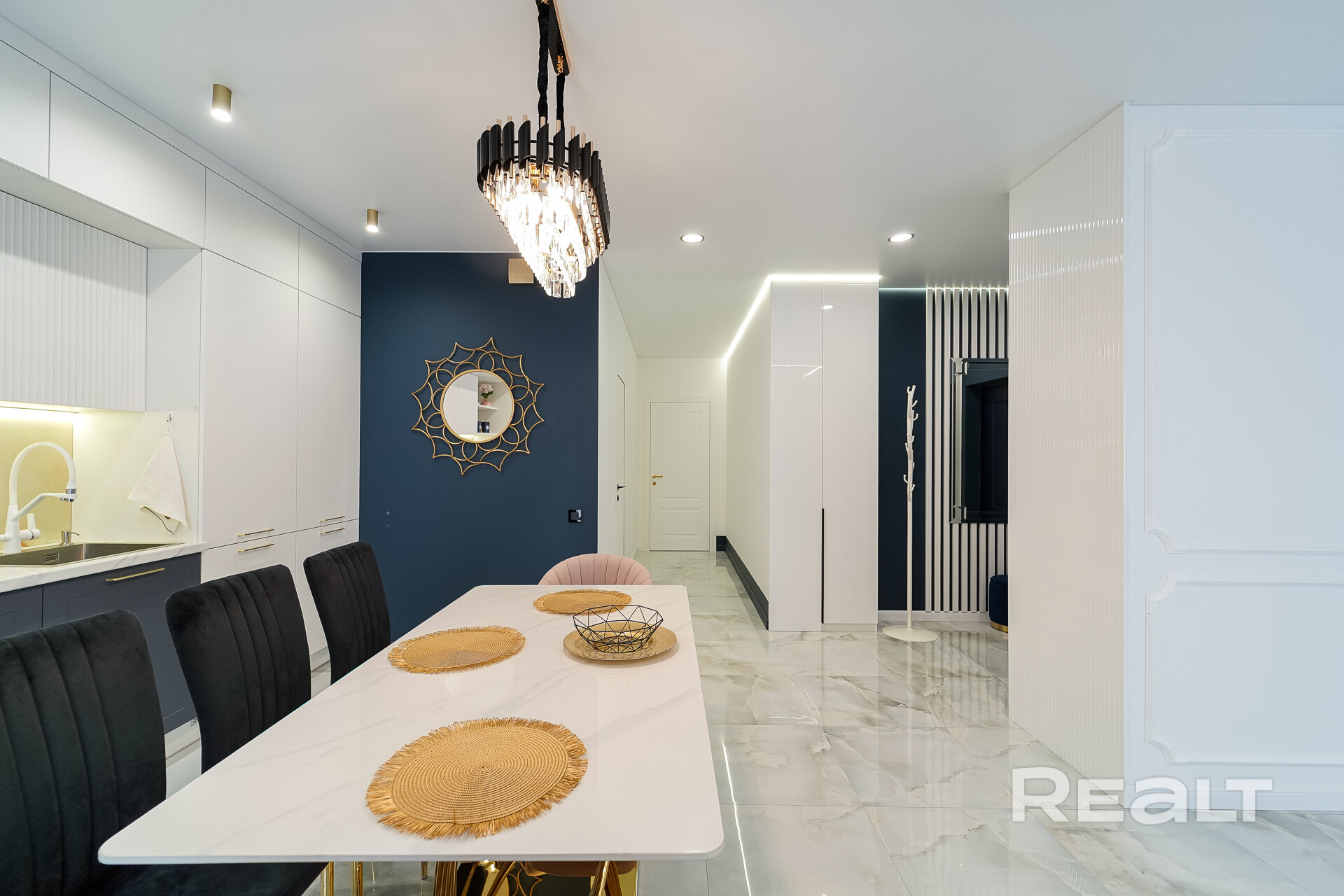 Кухня в сочетании цвета индиго и белого с вертикальными линейными фасадами, оборудована посудомоечной машиной, встроенным холодильником, системой фильтрации воды, встроенная индукционная плита с конвекторной духовкой. Сочетание золота и белого глянцевого камня столешницы в обеденной группе, полностью дополняют весь интерьер квартиры.