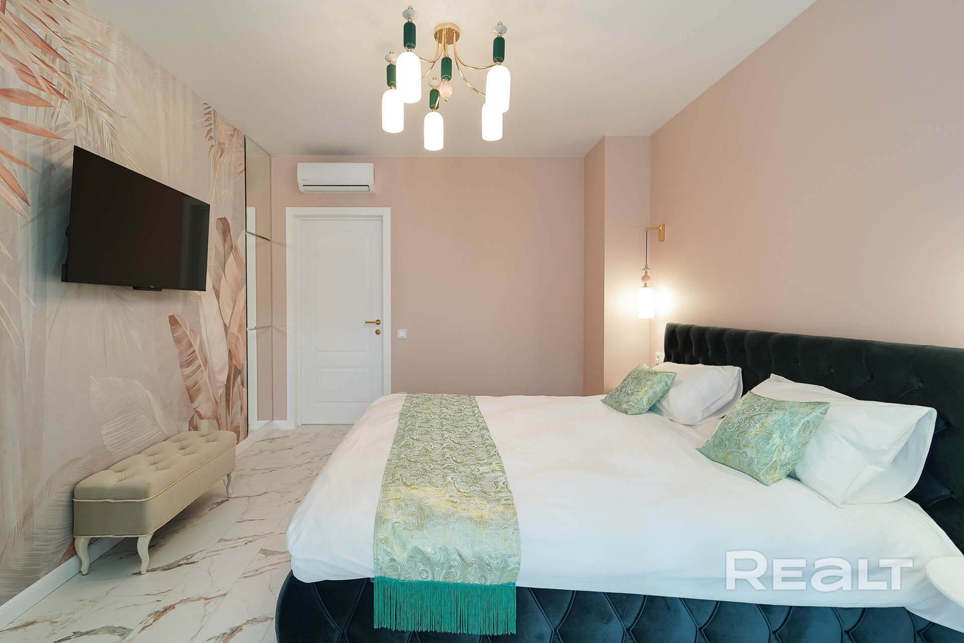 Отдельная, удалённая спальная комната с персональной каменной ванной и встроенным напольным белым смесителем- это просто уникальность данной квартиры. Ванна с панорамными окнами и выходом на личную, солнечную террасу! Мечта! Белые, раздвижные перегородки и итальянские шторы отделяют зону ванны от основной спальной комнаты. В комнате большая кровать с ортопедическим матрасом и текстильной отделкой. Подвесные прикроватные бра и люстра из последних итальянских коллекций, прекрасно дополняют весь интерьер спальни. В квартире установлено 2 кондиционера, что сделает Ваш отдых, тёплым и освежающим в любую погоду.