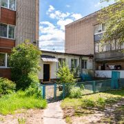 Большой благоустроенный двор с оборудованной детской площадкой. До детского садика двести метров. Два продовольственных магазина в трех минутах от дома