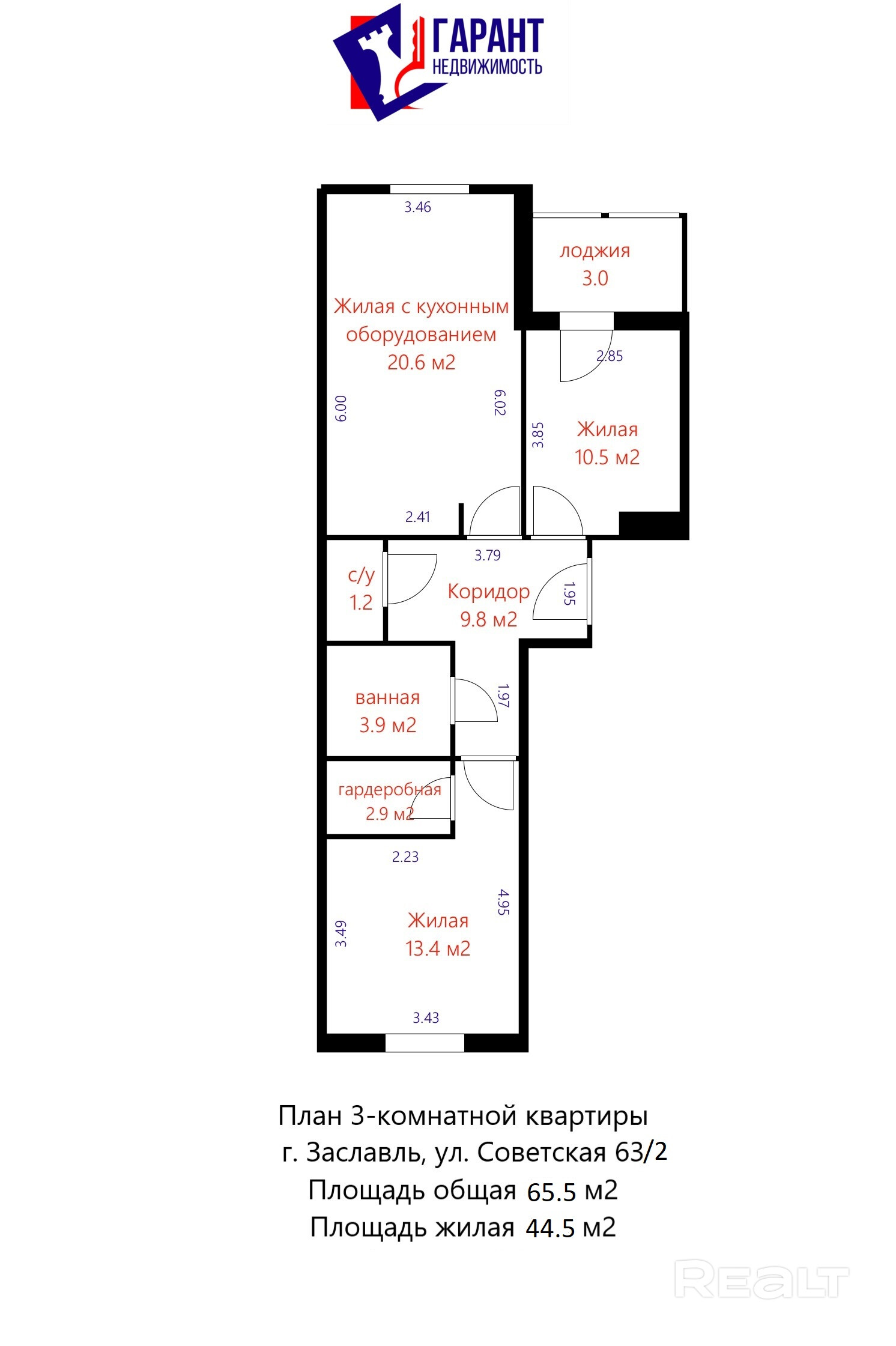 Общая площадь по СНБ 65.5 кв.м.