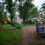 Тихий двор, утопающий в зелени. Во дворе детская площадка.