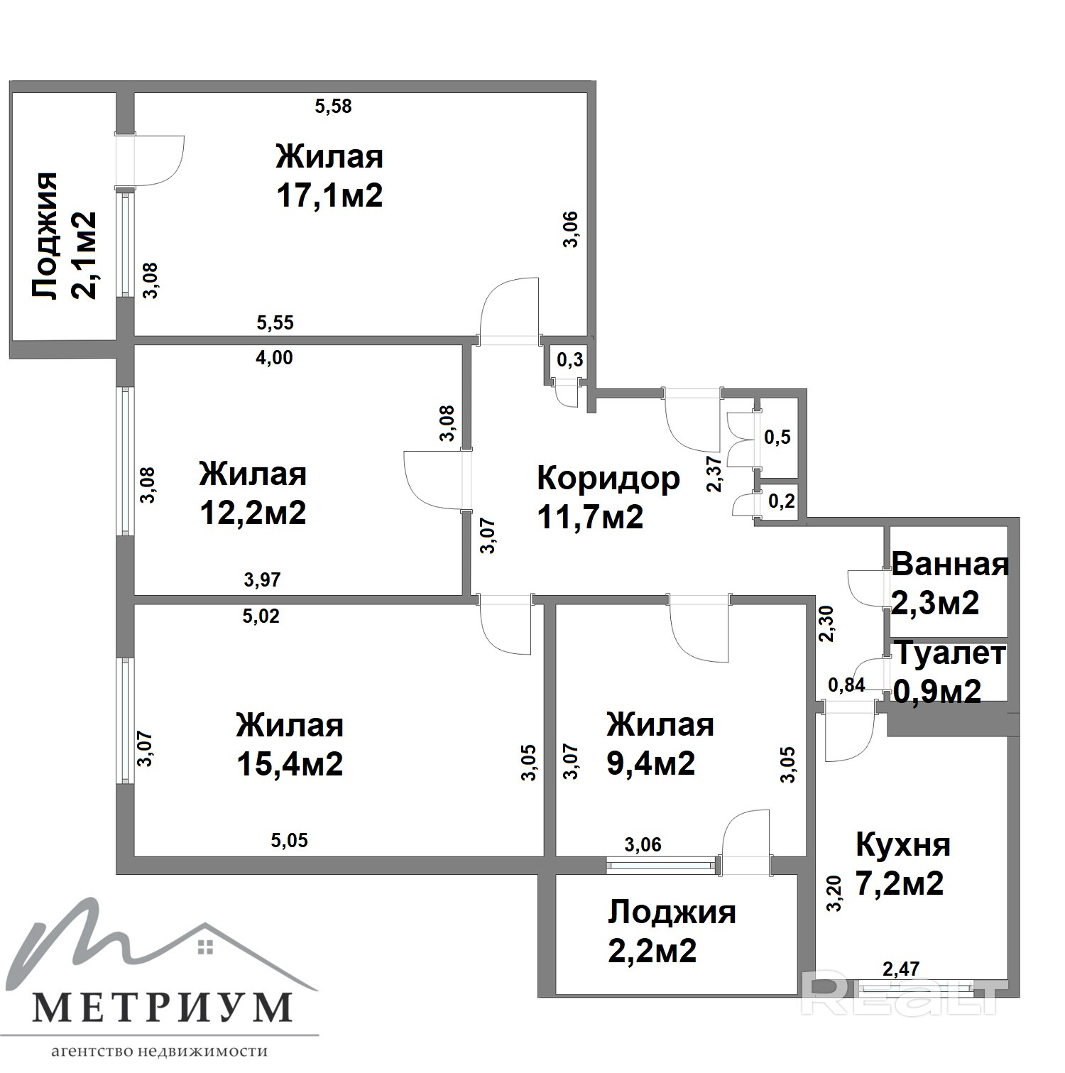 Комнаты - 17,1 м2 15,4 м2,12,2 м2, 9,4 м2.