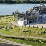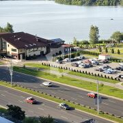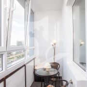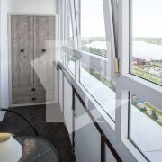Окна квартиры выходят на живописный вид, где открывается панорама на озеро, что создает ощущение спокойствия и уединения. Большие панорамные окна пропускают много естественного света, делая пространство светлым и воздушным.