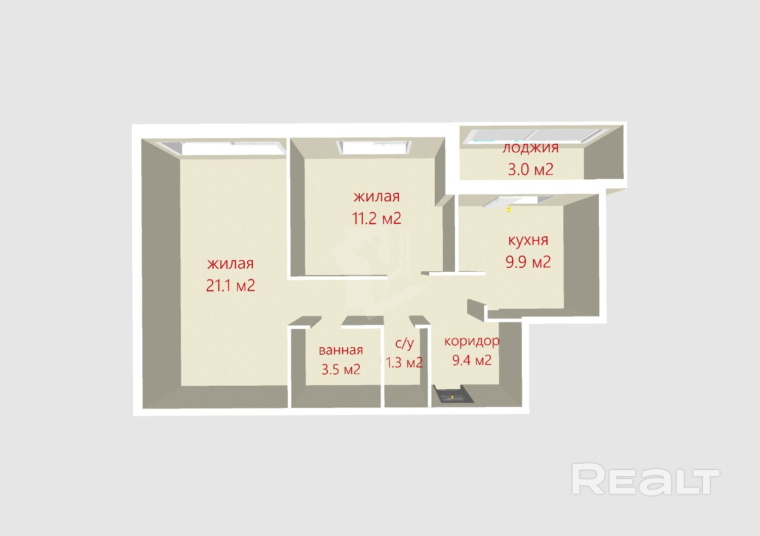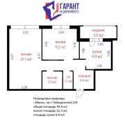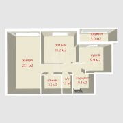 Общая площадь квартиры составляет 59,4 квадратных метра, из которых жилой фонд занимает 32,3 м2, а кухня — 9,9 м2. В квартире расположены две просторные комнаты, каждая из которых отлично подойдет для отдыха и работы. Просторные и светлые комнаты создают ощущение уюта.