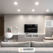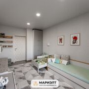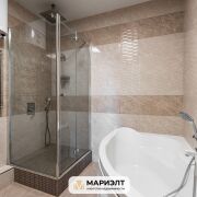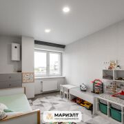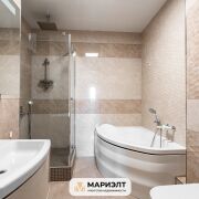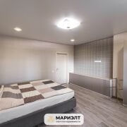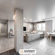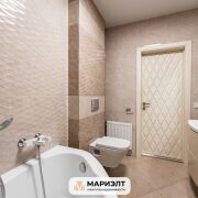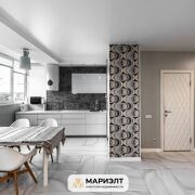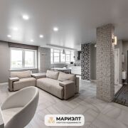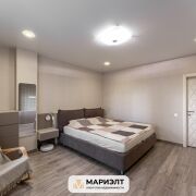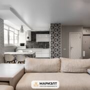 В комнатах на полу ламинат, потолки натяжные, изысканные обои. В прихожей, в жилой совмещенной с кухней на полу плитка. Санузлы отделаны светлой плиткой с дизайнерской раскладкой. Межкомнатные двери комбинированные, массив с эко-шпоном.