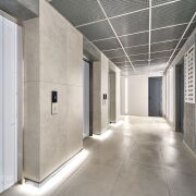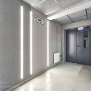 Достойная отделка лифтовых холлов и этажных коридоров. При отделке использованы современная плитка, декоративная штукатурка, подвесные потолки с ярким освещением.