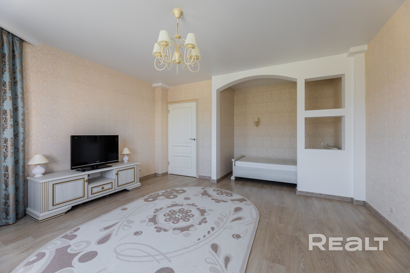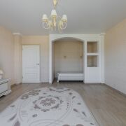 Полностью готова к проживанию. Жилая комната с нишей, окно с эркером (очень много света). Стены оклеены обоями (производство Бельгии). Потолки натяжные. На полу уложен ламинат.