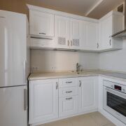 Кухня встроенная, из натурального ясеня. Варочная поверхность и духовой шкаф Bosch. Вытяжка Elica. Холодильник Gorenje. Кухонный фартук выложен итальянской плиткой, пол в кухне - плитка (производство Италия). Смеситель Hansgrohe.