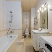 Санузел - 3.22 кв.м. Стены и пол выложены плиткой (производство Керамин), серия «Органза», унитаз производство также Керамин, умывальник Cersanit. Смесители Hansgrohe.