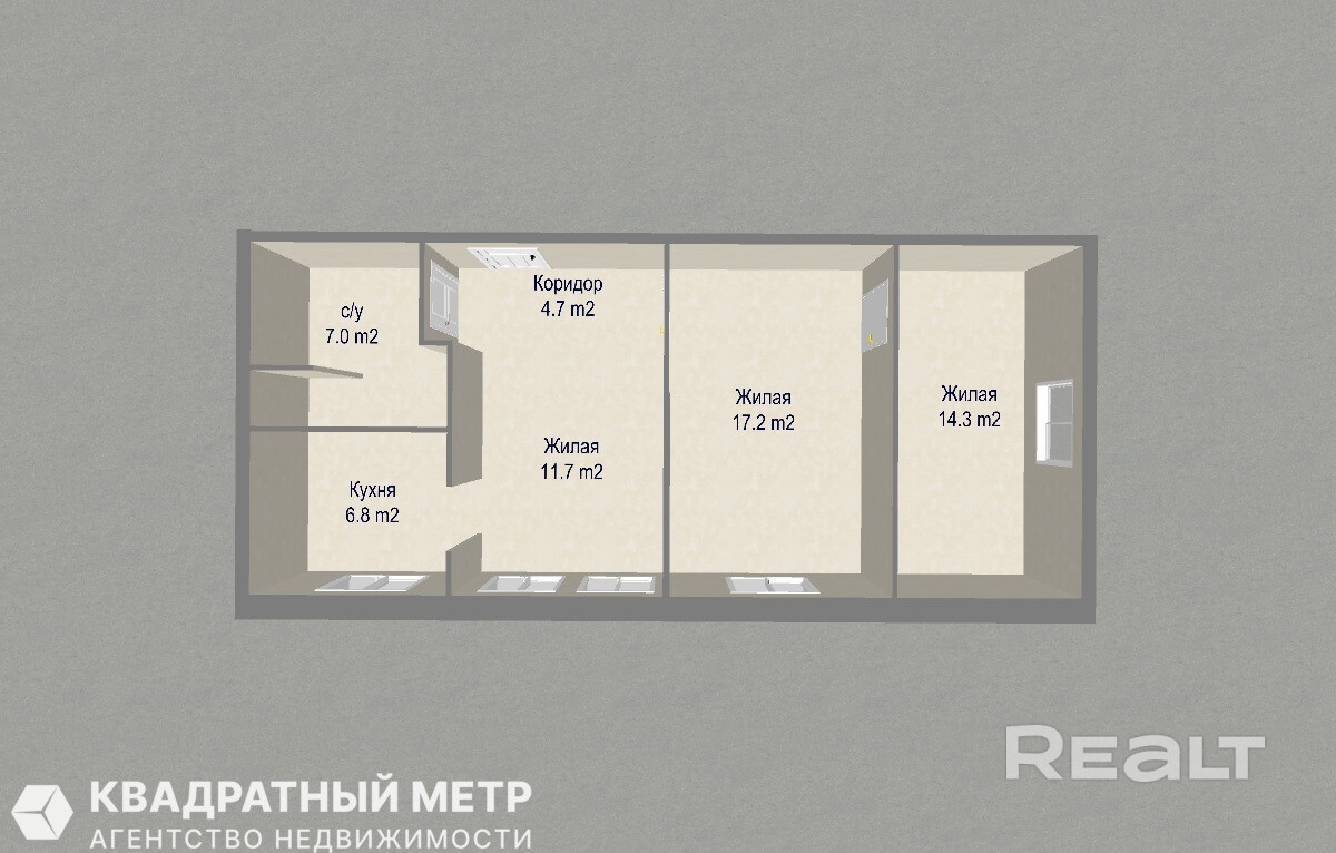 • Простор и планировка: Общая площадь 61.7 м2, жилая — 43.2 м2. Большие комнаты, высокие потолки — здесь легко дышится и комфортно живётся.