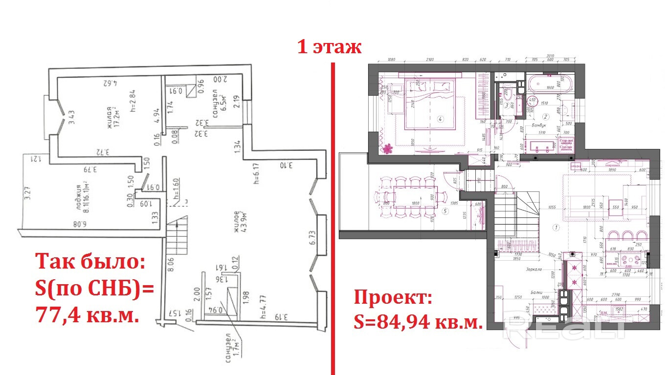 Проектная площадь квартиры после перепланировки – 151,23 кв.м., первоначальная – 118,0 кв.м. по СНБ. Узаконивание новой планировки уже нанятым специалистом будет производиться после возведения стен в санузлах по проекту и поставлена сантехника, согласно предпочтений нового владельца. По проекту уже утеплённые лоджии могут быть застеклены и использованы как полноценные комнаты (столовая на первом этаже и комната отдыха на втором).