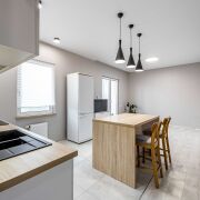 Встроенная кухня с доводчиками и техникой (индукционная варочная поверхность и духовой шкаф Bosch, вытяжка). Кухня оборудована барным столом-островом.