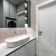 Раздельный санузел облицован керамогранитом, установлена инсталляция Viega, подвесной унитаз Villeroy & Boch, душевая со стойкой и тропическим душем скрытого монтажа Hansgrohe.