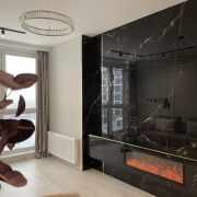 В гостиной установлен современный камин, удобный дизайнерский диван, обеденный стол со столешницей из керамогранита и стулья с вращающимся механизмом.