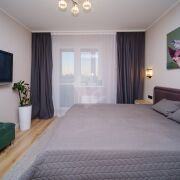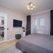 Спальня: Стильная и уютная с гардеробной комнатой. Большая кровать с премиальным матрасом - Vegas, телевизор. Здесь же выход на застекленную лоджию, где на полу уложена плитка, есть места для хранения, отдыха, а также установлен натяжной потолок с освещением.