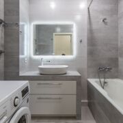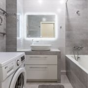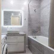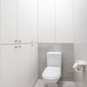 Сан.узел: раздельный. В современной плитке. В ванной комнате имеются места для хранения мелочей, установлена большая ванна, умывальник, стиральная машина. В туалете установлен унитаз и имеется большое количество мест для хранения бытового инвентаря.