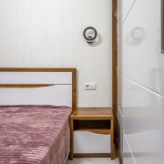Спальня: панорамные окна в пол, с возможностью выхода на террасу, с установленной большой кроватью, шкафом-купе, комодом для хранения вещей и телевизором. Имеется кондиционер.