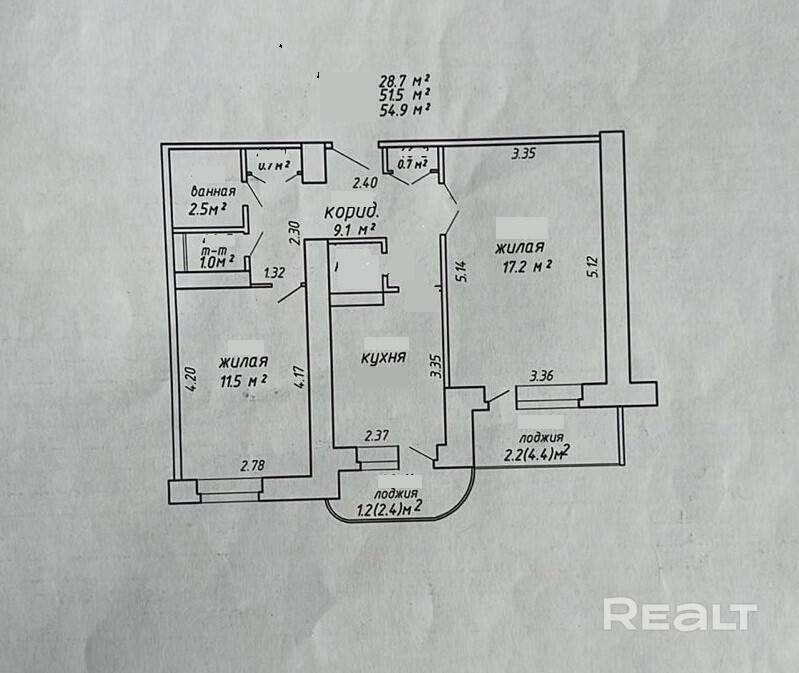 Общая площадь 54.9 м. кв., площадь жилых комнат 28.9 м. кв..