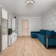 - Ремонт выполнен качественно. На полу уложен ламинат, стены оклеены обоями, установлены натяжные потолки. Раздельный санузел облицован плиткой, что делает помещение практичным и долговечным.