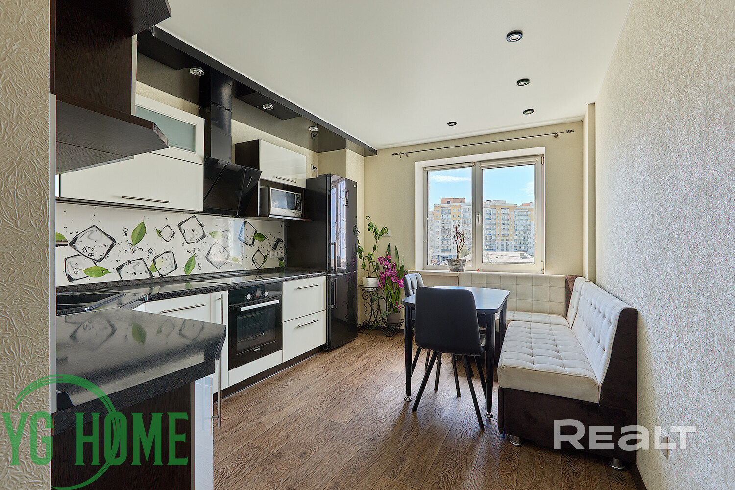 Кухня полностью укомплектована бытовой техникой (холодильник LG, посудомоечная машина электролюкс, духовой шкаф и варочная панель BOSСH, вытяжка, микроволновая печь, система фильтрации воды) и мебелью.