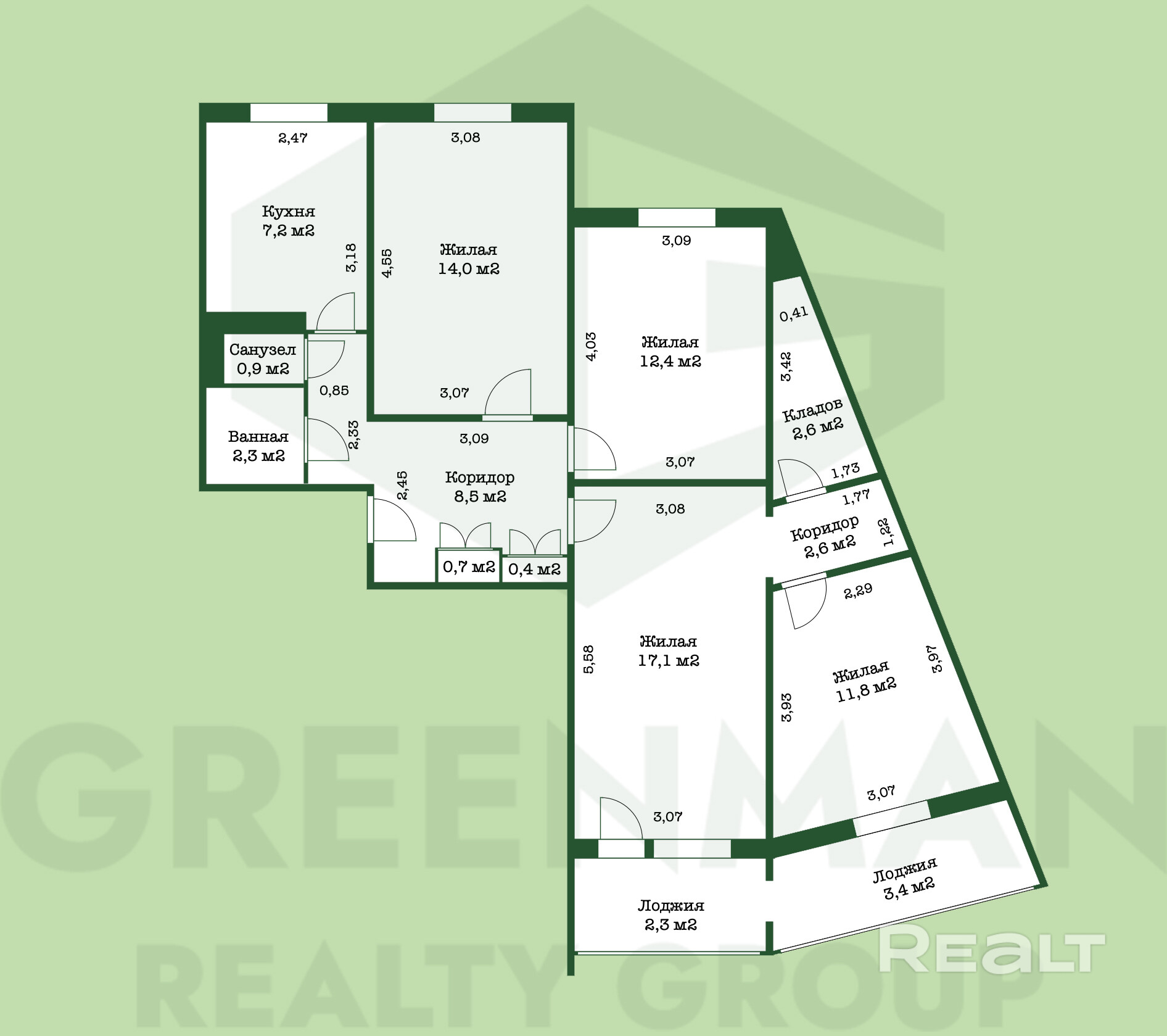 Входные двери в квартиру металлические, на полу линолеум. Окна квартиры выходят на две стороны дома: кухня, две комнаты- на западную сторону, проходная и маленькая комнаты – на восточную сторону. На окнах установлены стеклопакеты.