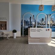 Дизайнерское лобби, стойка для консьержа и зона ожидания.