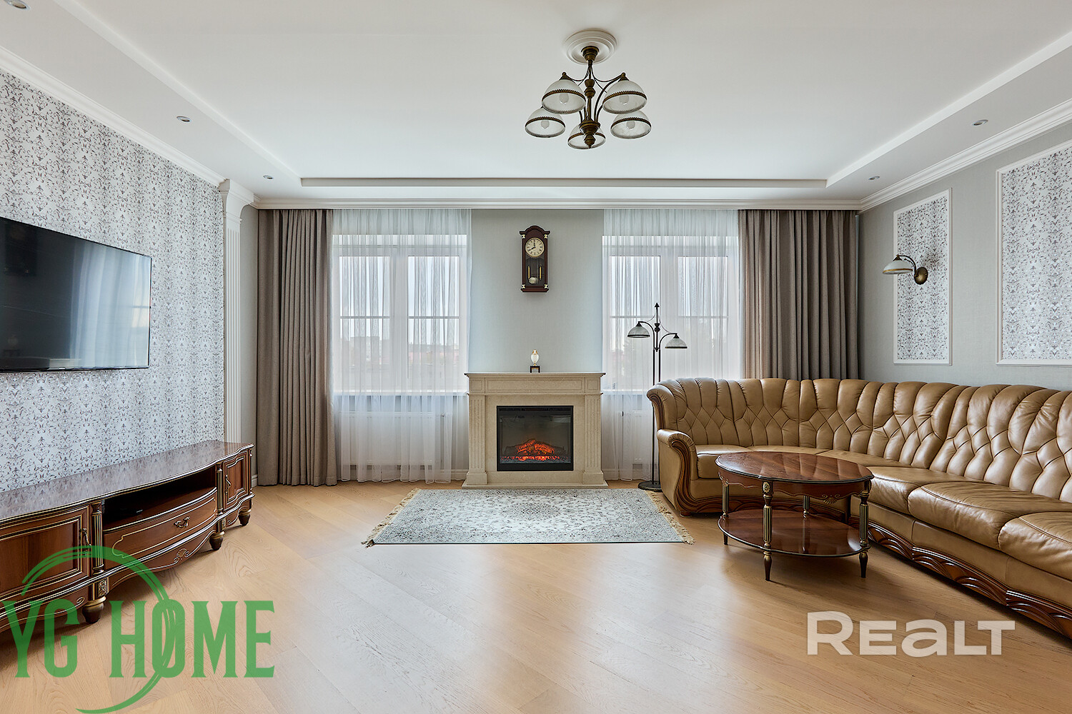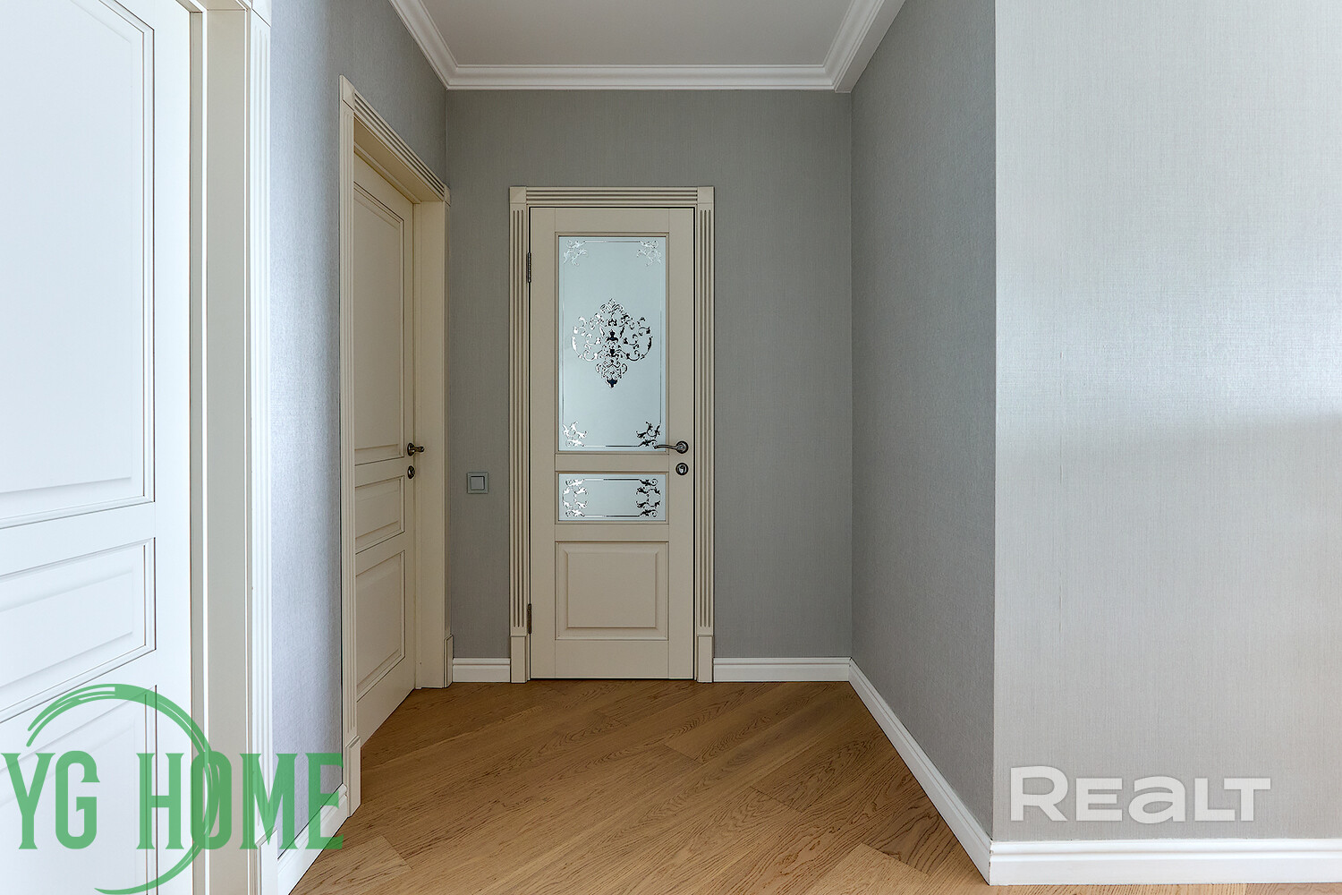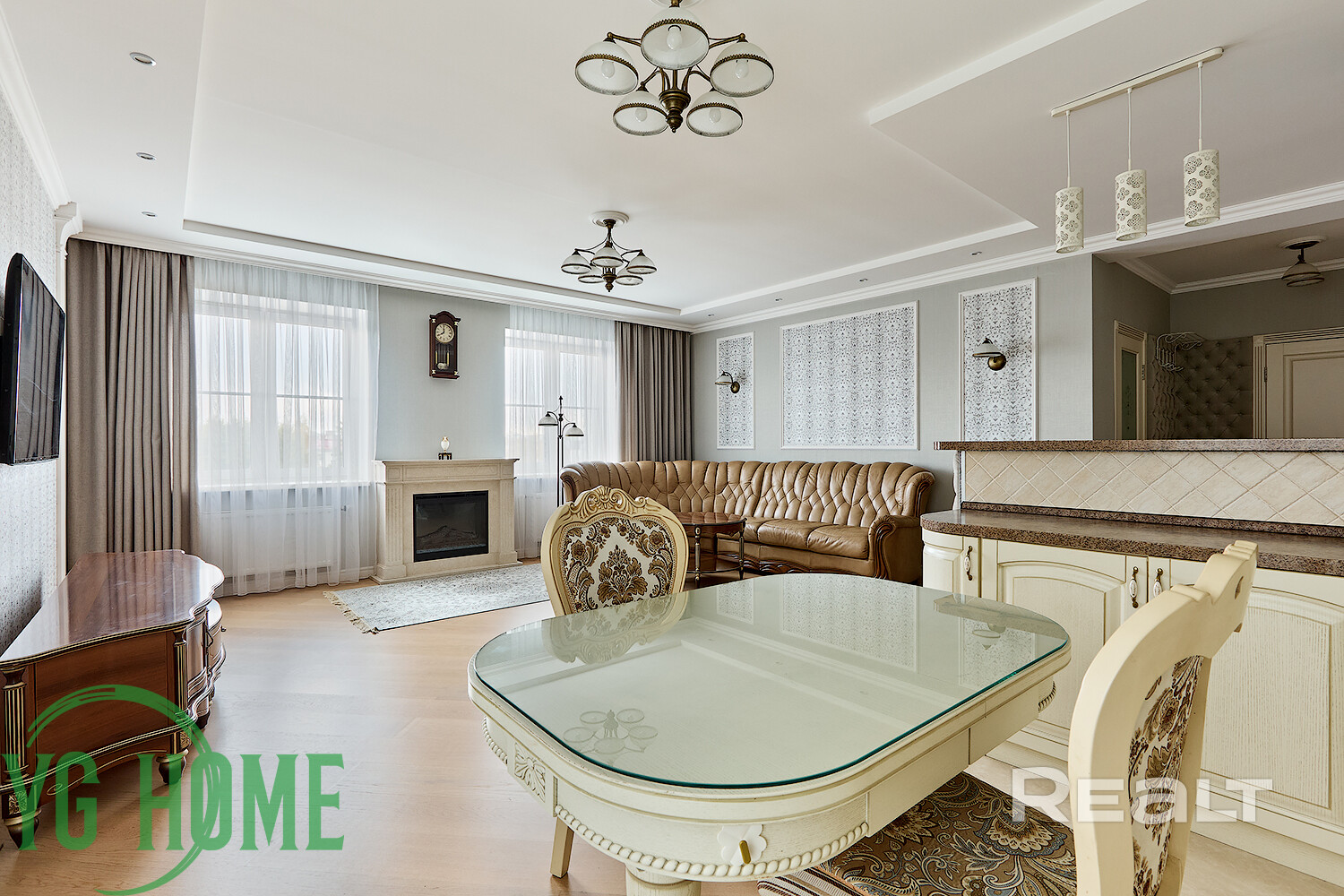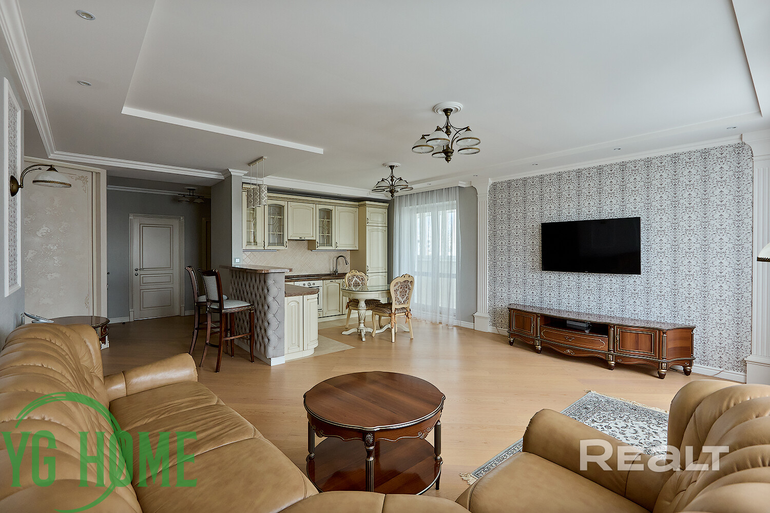 Квартира отличается продуманной планировкой и стильным классическим интерьером. В ней выполнен качественный ремонт, установлена современная дорогая мебель и бытовая техника, которая остаётся новым владельцам. Общая площадь квартиры составляет 98,1 м2, жилая – 66,1 м2, кухня-гостиная – 33,7 м2. Планировка включает в себя два санузла (6,5 и 1,9 м2) и застеклённую лоджию (7,3 м2). На полу в коридоре, кухне и санузлах уложена плитка, в жилых комнатах – дубовая паркетная доска.