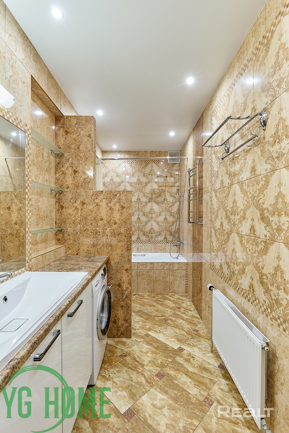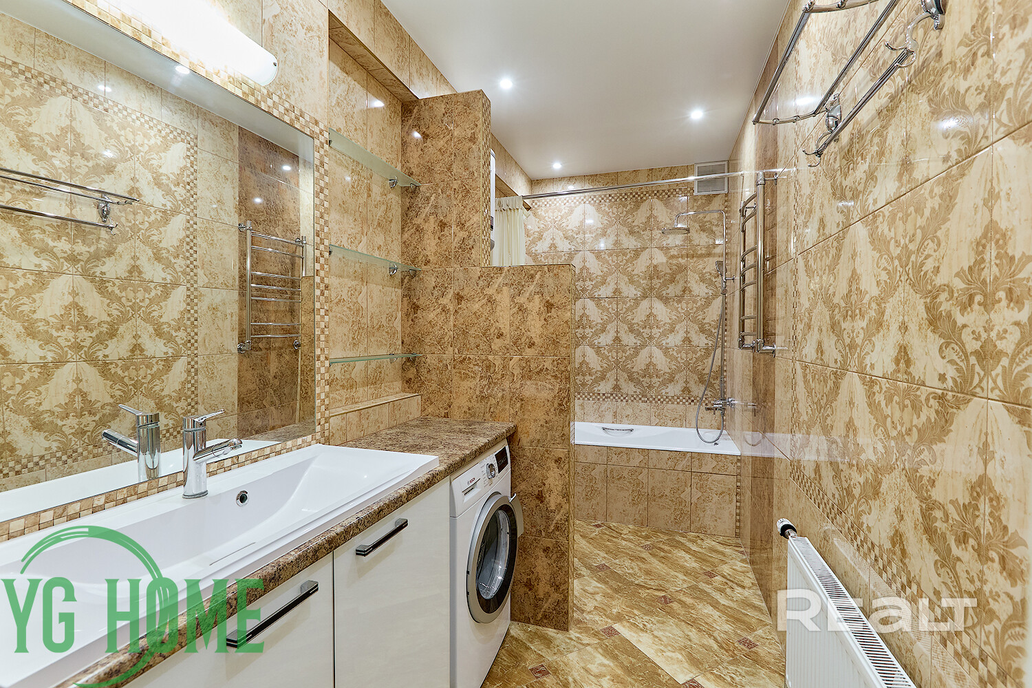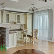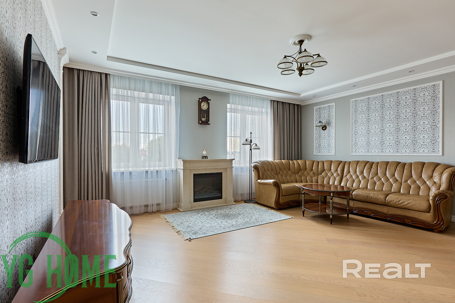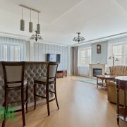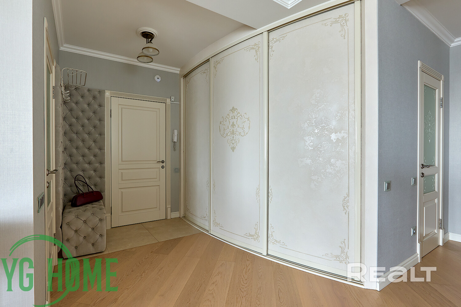 Квартира отличается продуманной планировкой и стильным классическим интерьером. В ней выполнен качественный ремонт, установлена современная дорогая мебель и бытовая техника, которая остаётся новым владельцам. Общая площадь квартиры составляет 98,1 м2, жилая – 66,1 м2, кухня-гостиная – 33,7 м2. Планировка включает в себя два санузла (6,5 и 1,9 м2) и застеклённую лоджию (7,3 м2). На полу в коридоре, кухне и санузлах уложена плитка, в жилых комнатах – дубовая паркетная доска.