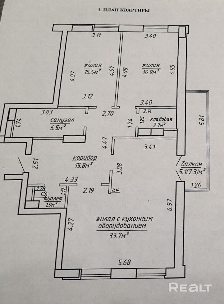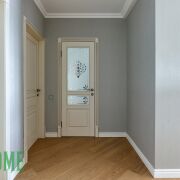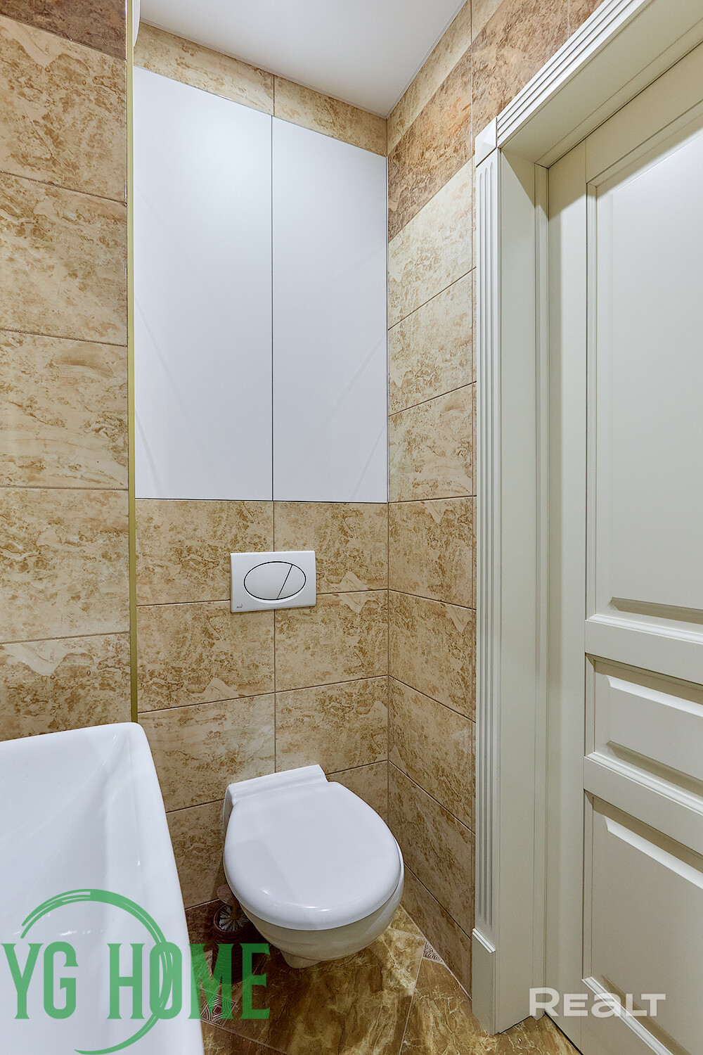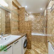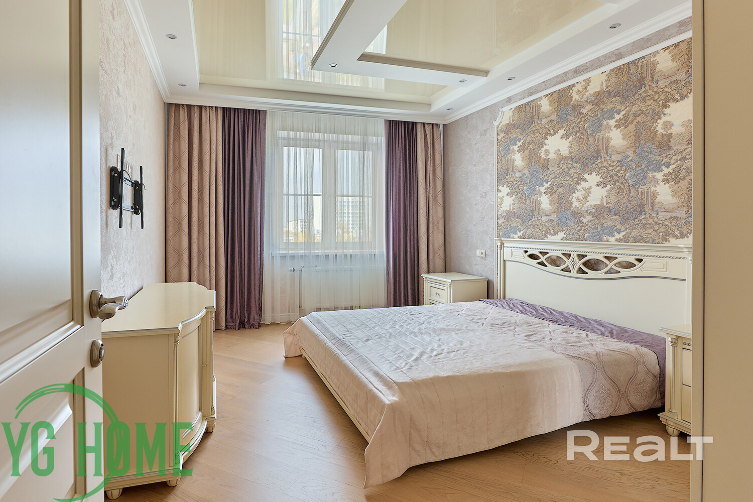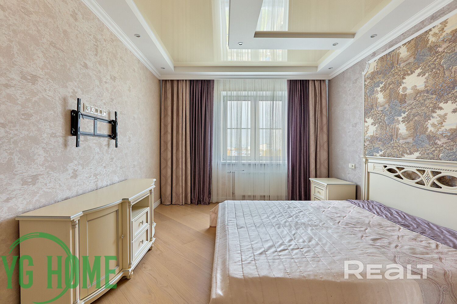 Квартира отличается продуманной планировкой и стильным классическим интерьером. В ней выполнен качественный ремонт, установлена современная дорогая мебель и бытовая техника, которая остаётся новым владельцам. Общая площадь квартиры составляет 98,1 м2, жилая – 66,1 м2, кухня-гостиная – 33,7 м2. Планировка включает в себя два санузла (6,5 и 1,9 м2) и застеклённую лоджию (7,3 м2). На полу в коридоре, кухне и санузлах уложена плитка, в жилых комнатах – дубовая паркетная доска.