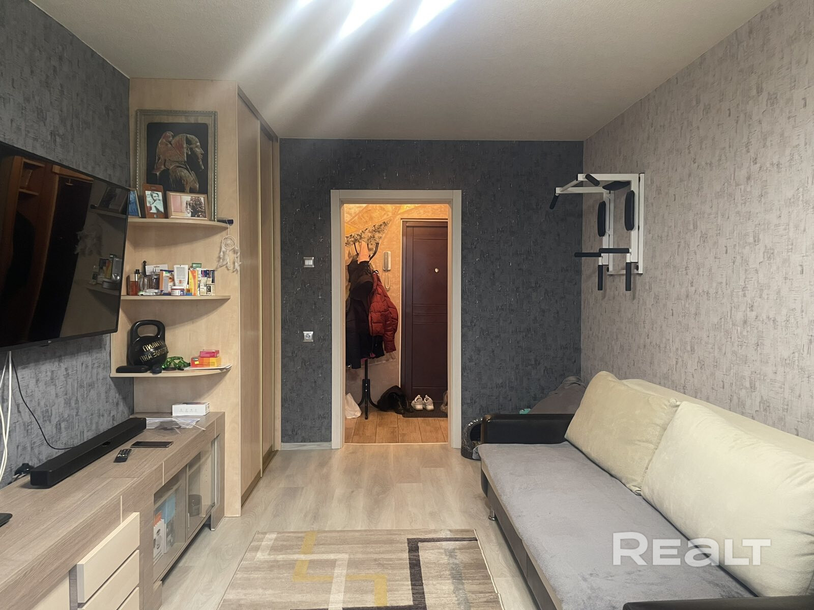 При продаже в квартире остаётся мебель в комнате, шкаф в прихожей, кухня и бытовая техника: холодильник LG, стиральная машина LG, 2 телевизора LG, варочная панель газовая Gefest, духовой электрический шкаф Gefest, вытяжка кухонная Exiteq.
