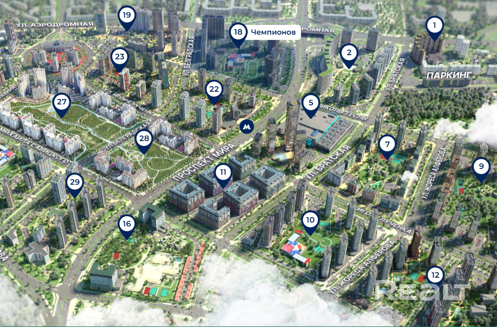 Вся собственная инфраструктура Minsk World – школа, детский сад, взрослая и детская поликлиника, медицинский центр, кафе и магазины, парковки и заправки, спортивные залы и фитнес-центры, торгово-развлекательный центр АВИА МОЛЛ с паркингом и МФЦ.